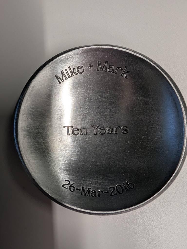 The 4" round Aluminum dish is made from a single piece of 1/8" thick aluminum. Great as a 10 year anniversary gift. The dish has a smooth brushed finish with black infilled engravings.