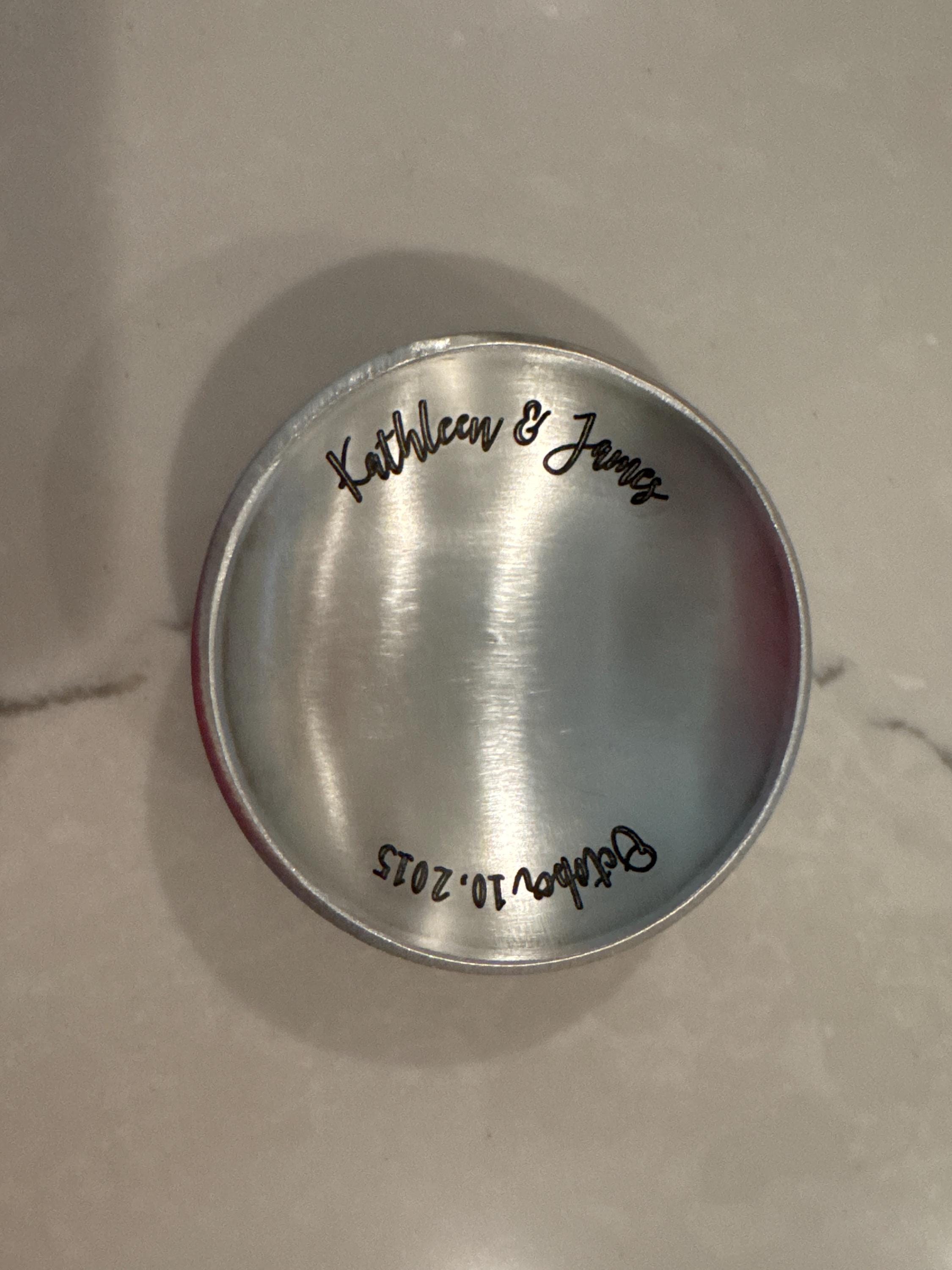 The 4" round Aluminum dish is made from a single piece of 1/8" thick aluminum. Great as a 10 year anniversary gift. The dish has a smooth brushed finish with black infilled engravings.